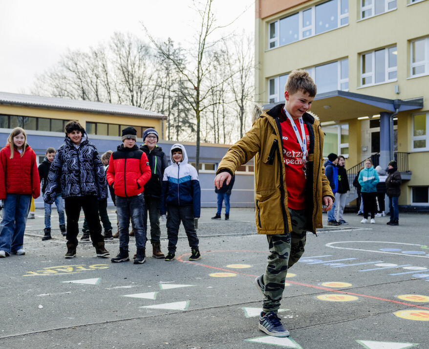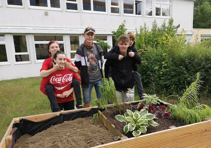 Wir haben auch einen Fußballplatz, einen Sportplatz, einen Schulgarten und einen Spielplatz, den unser Förderverein bezahlt hat. Das ist toll, weil so alle Kinder viel draußen sein und sich bewegen können.