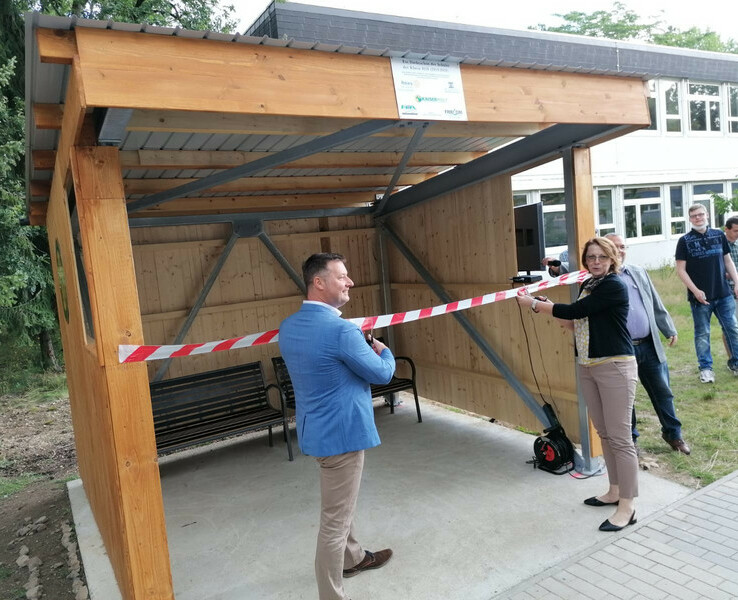 Am 17. Juli haben die Schüler der H10 den neuen Unterstand an die Schule übergeben. Fast alle, die geholfen haben, waren da, sogar der Bürgermeister.